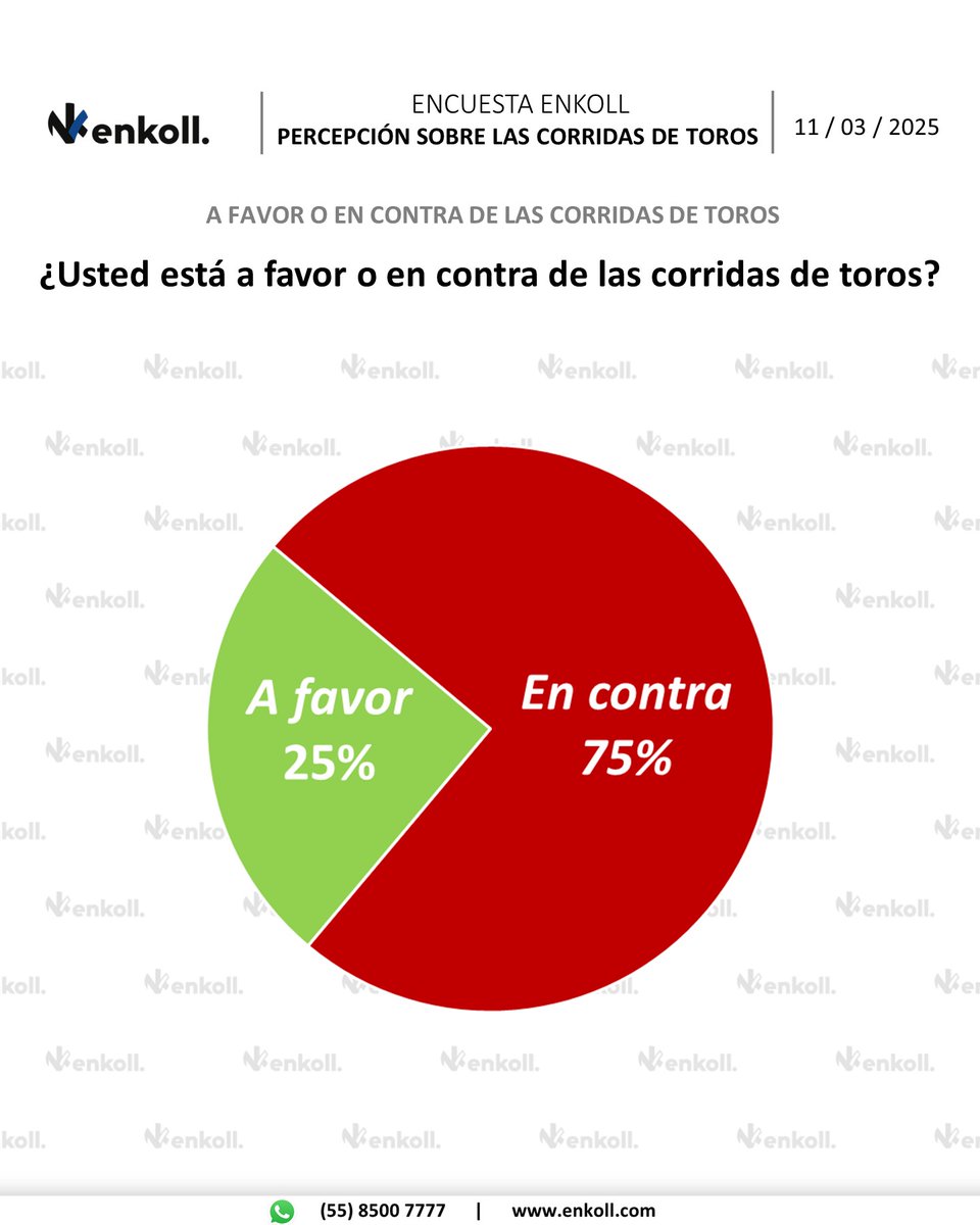 Una reciente encuesta realizada por Enkoll ha revelado un marcado rechazo hacia las corridas de toros entre los habitantes de la Ciudad de México. Según el estudio, el 75% de los capitalinos se opone a esta práctica taurina, mientras que solo un 25% la apoya.