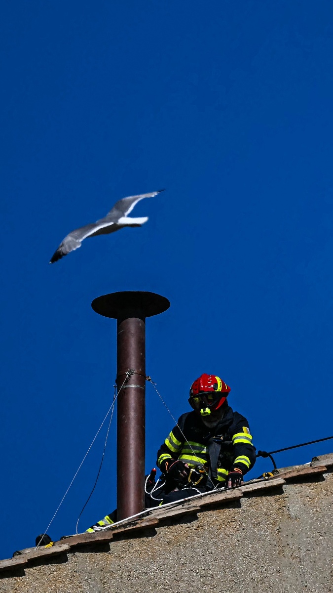 Alrededor de cuatro o cinco bomberos de la Santa Sede subieron al hastial del tejado del majestuoso edificio para colocar el humero: un cilindro marrón estrecho, por donde saldrá la fumata.