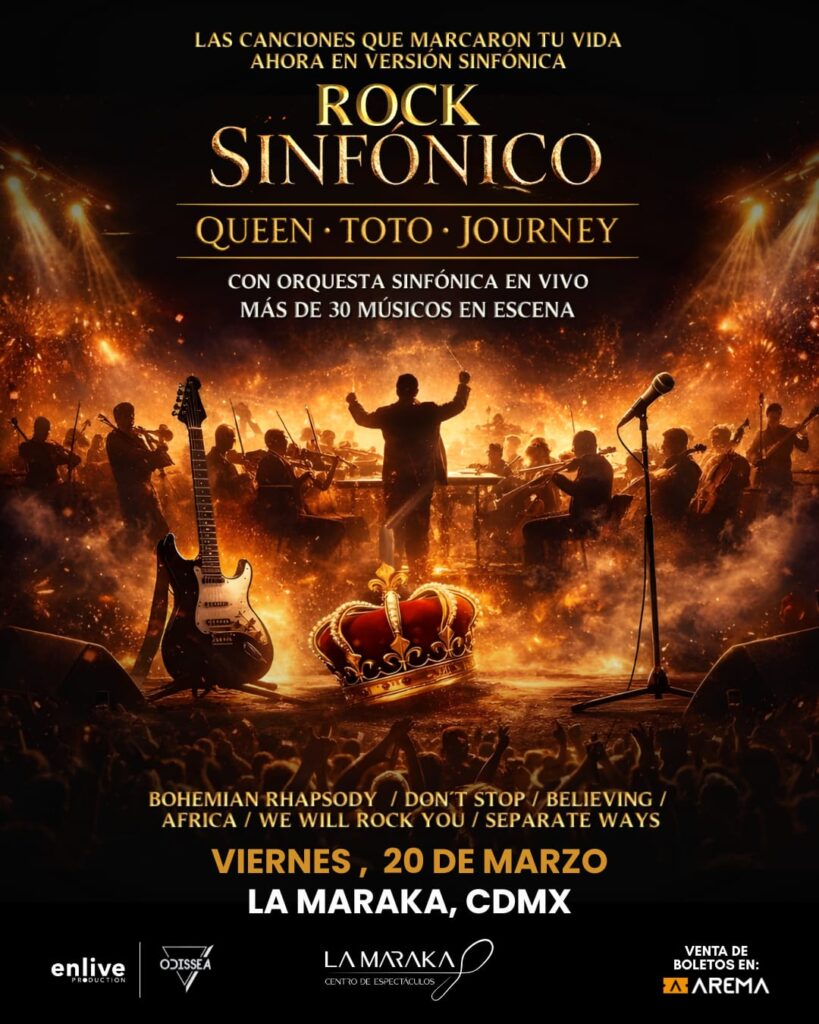 Así, Rock Sinfónico se perfila como una celebración del legado del rock clásico y de su capacidad para reinventarse sin perder su esencia. Una noche donde las canciones que marcaron épocas volverán a resonar, esta vez envueltas en la riqueza sonora de una orquesta completa, recordando que la música, cuando es verdaderamente grande, siempre encuentra nuevas formas de seguir emocionando. El show se llevará a cabo el próximo viernes 20 de marzo de 2026 a partir de las nueve de la noche en el Centro de Espectáculos La Maraka de la Ciudad de México. Boletos disponibles a través de la plataforma Arema.mx, así como en taquillas del inmueble.