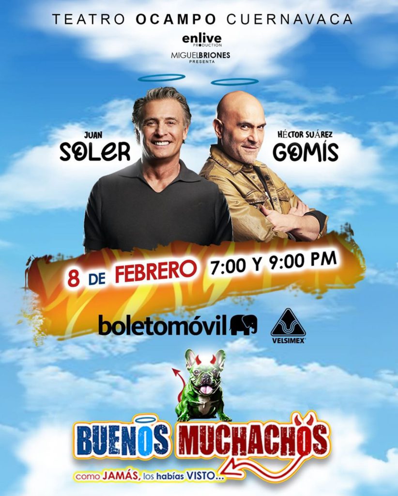 La obra de teatro «Buenos Muchachos», escrita, dirigida y protagonizada por Héctor Suárez Gomís, en colaboración con Juan Soler, se presentará en el Teatro Ocampo de Cuernavaca, Morelos, el sábado 8 de febrero, con dos funciones programadas a las 19:00 y 21:00 horas. Los boletos están disponibles para su adquisición a través de la plataforma Boletomóvil en el link https://lc.cx/8gWLAn