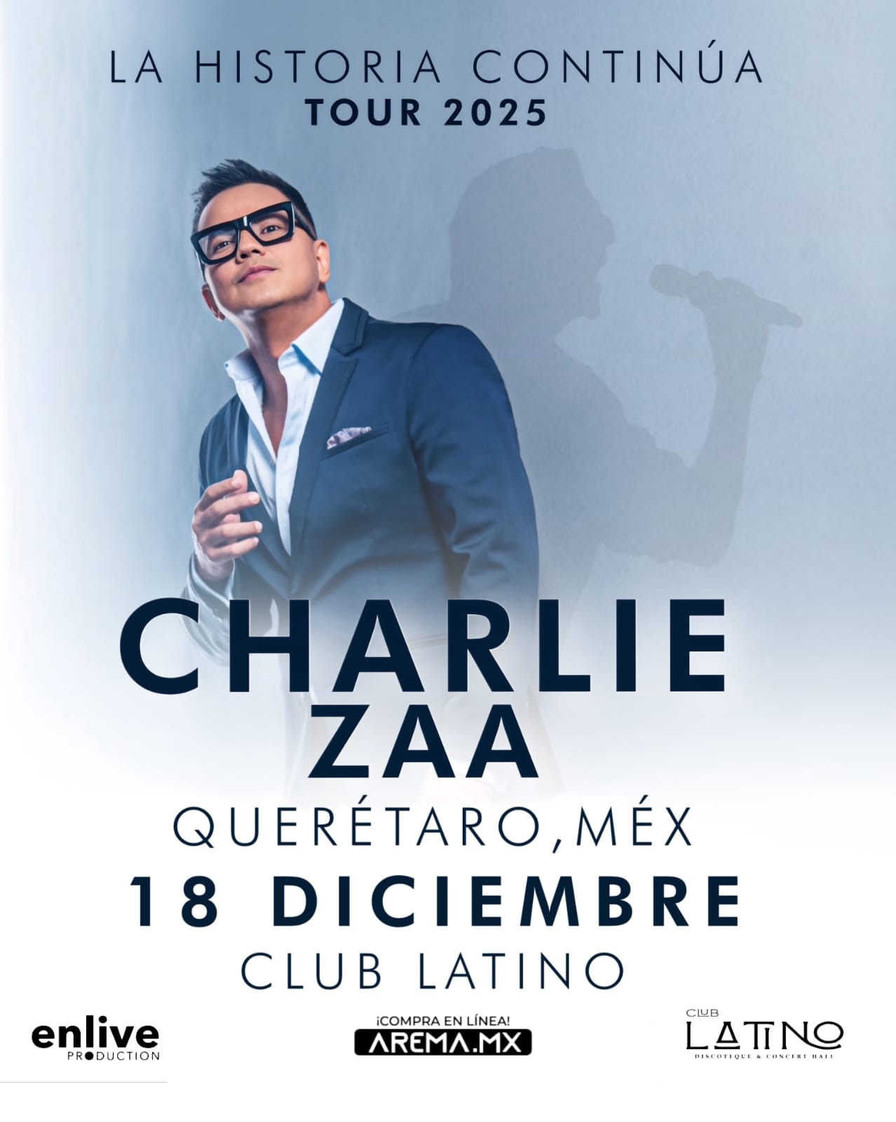 Charlie Zaa se presentará este jueves 18 de diciembre en el Club Latino de Querétaro. Los boletos ya están disponibles en el sistema Arema.mx. Se invita al público a asegurar su lugar con anticipación para disfrutar una de las veladas más esperadas del año.