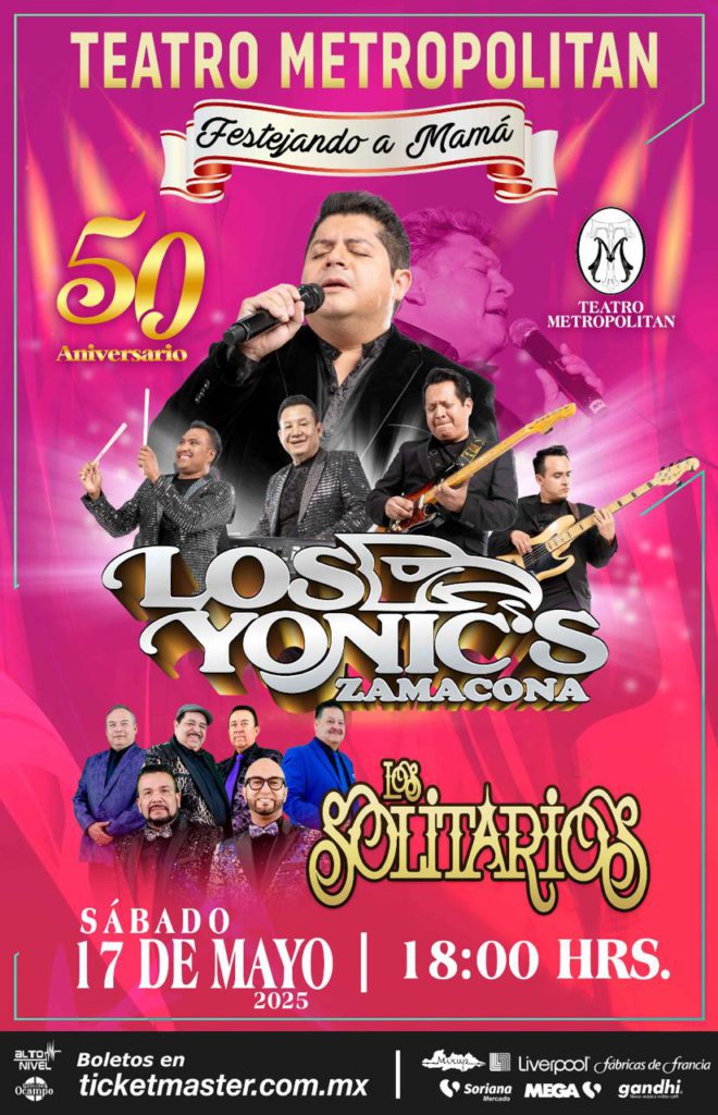 Este Sabado 17 de Mayo el Teatro Metropolitan será testigo de una velada inolvidable con la presentación de Los Yonic’s, el icónico grupo romántico liderado en su día por José Manuel Zamacona y ahora por su hijo José Manuel Zamacona, cuyo legado está haciéndose más grande con su tutela para celebrar su 50 Aniversario. La cita, a partir de las seis de la tarde, promete ser un viaje musical a través de cuatro décadas de éxitos que han dejado una huella imborrable en la música popular latinoamericana. Boletos a la venta en el Sistema Ticketmaster y en taquillas del inmueble. Los Solitarios serán los invitados de honor en esta presentación.