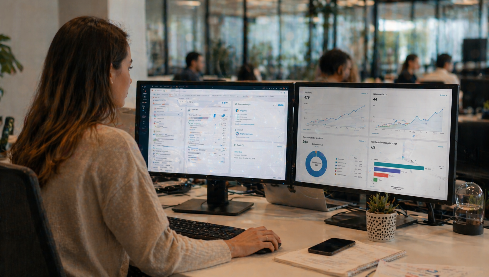 Ventas consultivas con HubSpot y Breeze AI. Para equipos comerciales con ciclos largos: secuencias de prospección, landing pages personalizadas por cuenta y agentes de IA que enriquecen y califican contactos. Está pensado para servicios financieros, despachos profesionales, logística y áreas de venta consultiva.