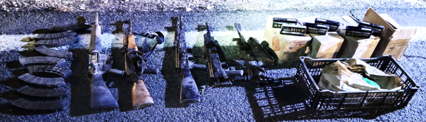 En Aldama, Chihuahua, se aseguraron ocho armas de fuego, 17 cargadores, 2 mil 899 cartuchos, cuatro artefactos explosivos improvisados, un remolque y ocho vehículos, sin personas detenidas.