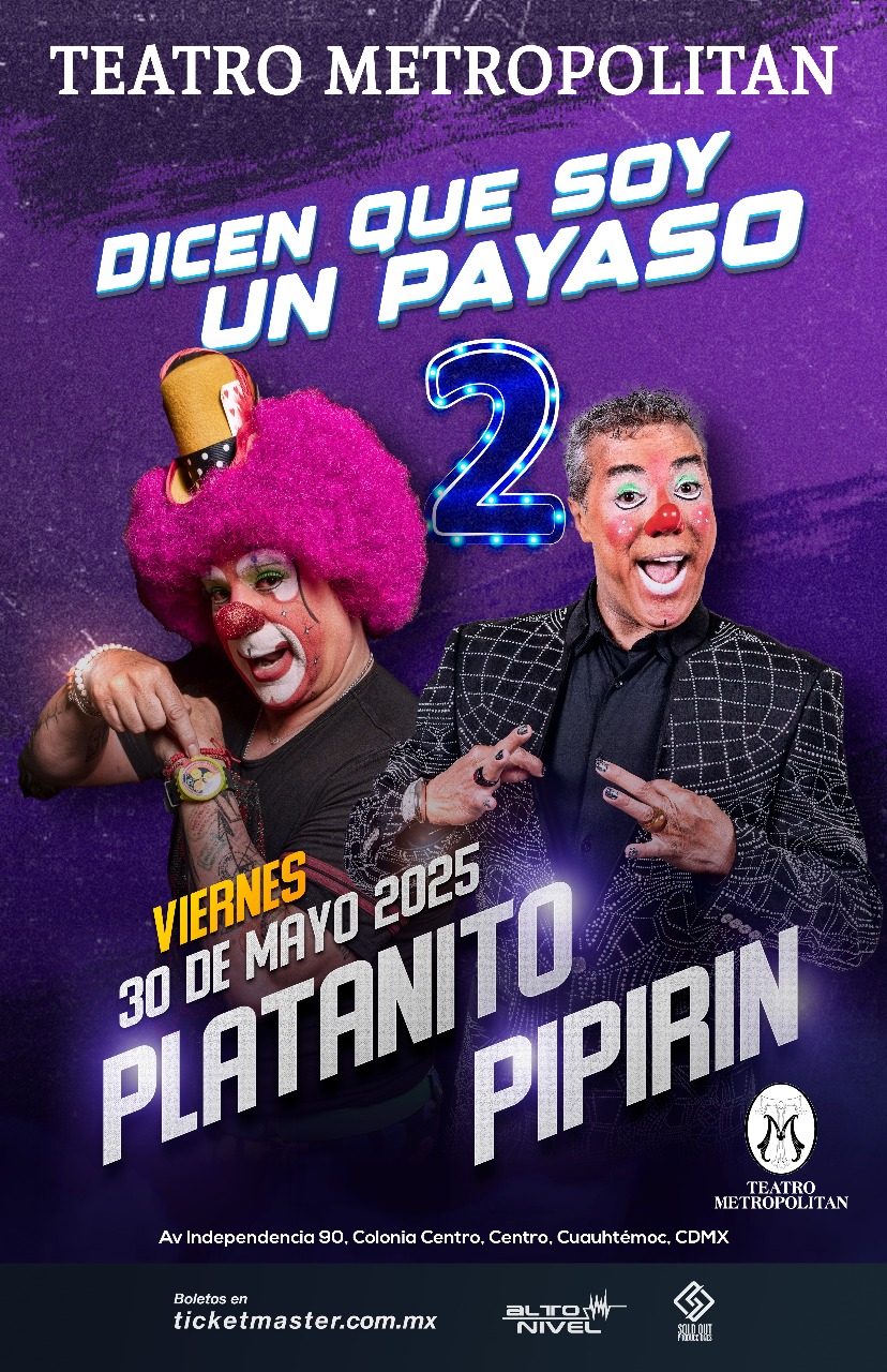 Los boletos para el espectáculo “Dicen que Soy un Payaso 2” ya están disponibles a través del sistema Ticketmaster y en las taquillas del Teatro Metropólitan. El espectáculo “Dicen que Soy un Payaso 2” no solo será una oportunidad para reír, sino también para celebrar la trayectoria de dos de los comediantes más queridos de México. Con su humor característico, su capacidad para improvisar y su conexión única con el público, Platanito y Pipirín están listos para ofrecer una noche que quedará grabada en la memoria de todos los asistentes.