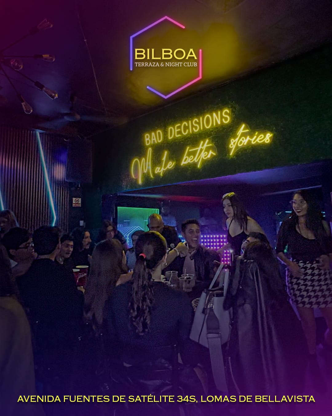 Situado en Av. Fuentes de Satélite 34s, Lomas de Bellavista, Bilboa ofrecer a todos los asistentes, la posibilidad de disfrutar de dos ambientes diferentes. Para quienes prefieren una experiencia más relajada, la terraza con música en vivo es el lugar ideal. Para los que buscan una noche de fiesta, el night club con DJ los llevará a explotar todos sus sentidos.